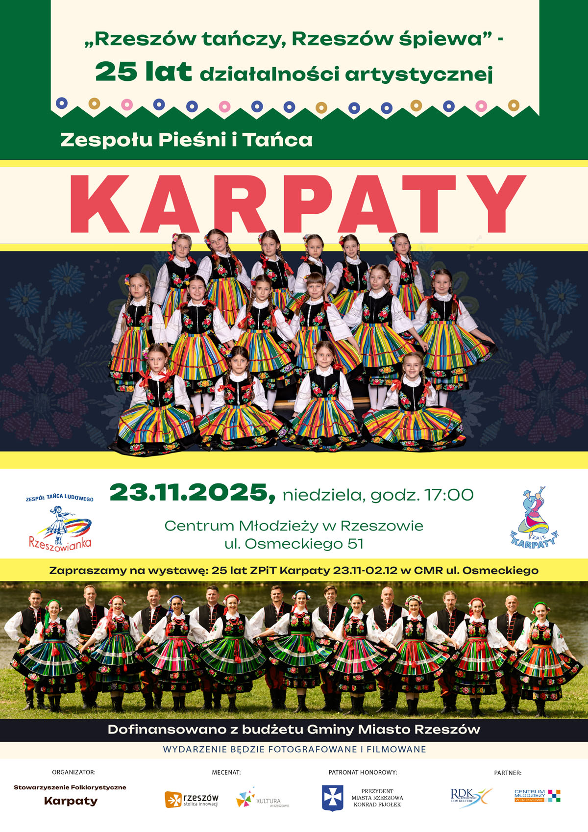 23 listopada 2025 roku o godzinie 17:00 w Centrum Młodzieży w Rzeszowie przy ul. Osmeckiego 51 odbędzie się drugi koncert jubileuszowy w ramach wydarzenia „Rzeszów tańczy, Rzeszów śpiewa” – 25 lat działalności artystycznej Zespołu Pieśni i Tańca Karpaty.