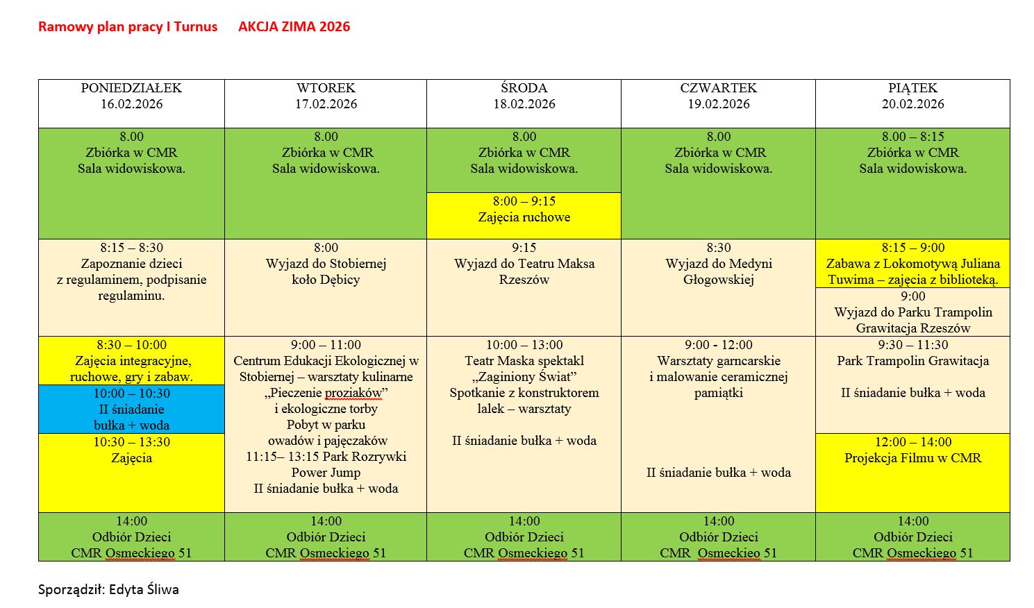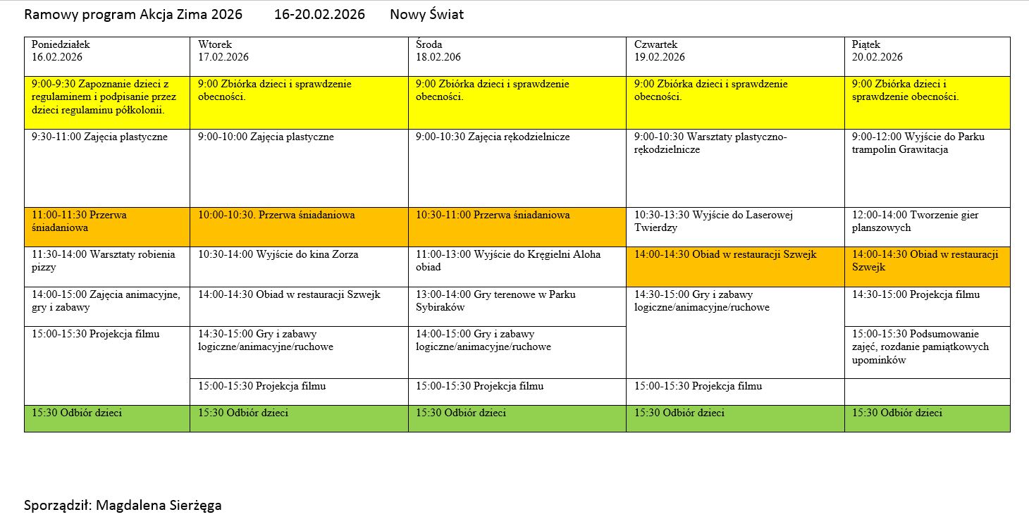 1 tydzień - ramowy plan pracy półkolonia zimowa 2026