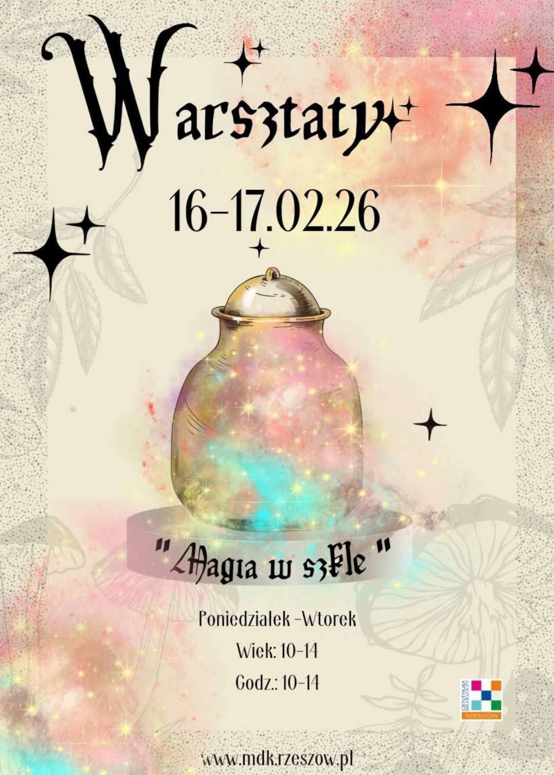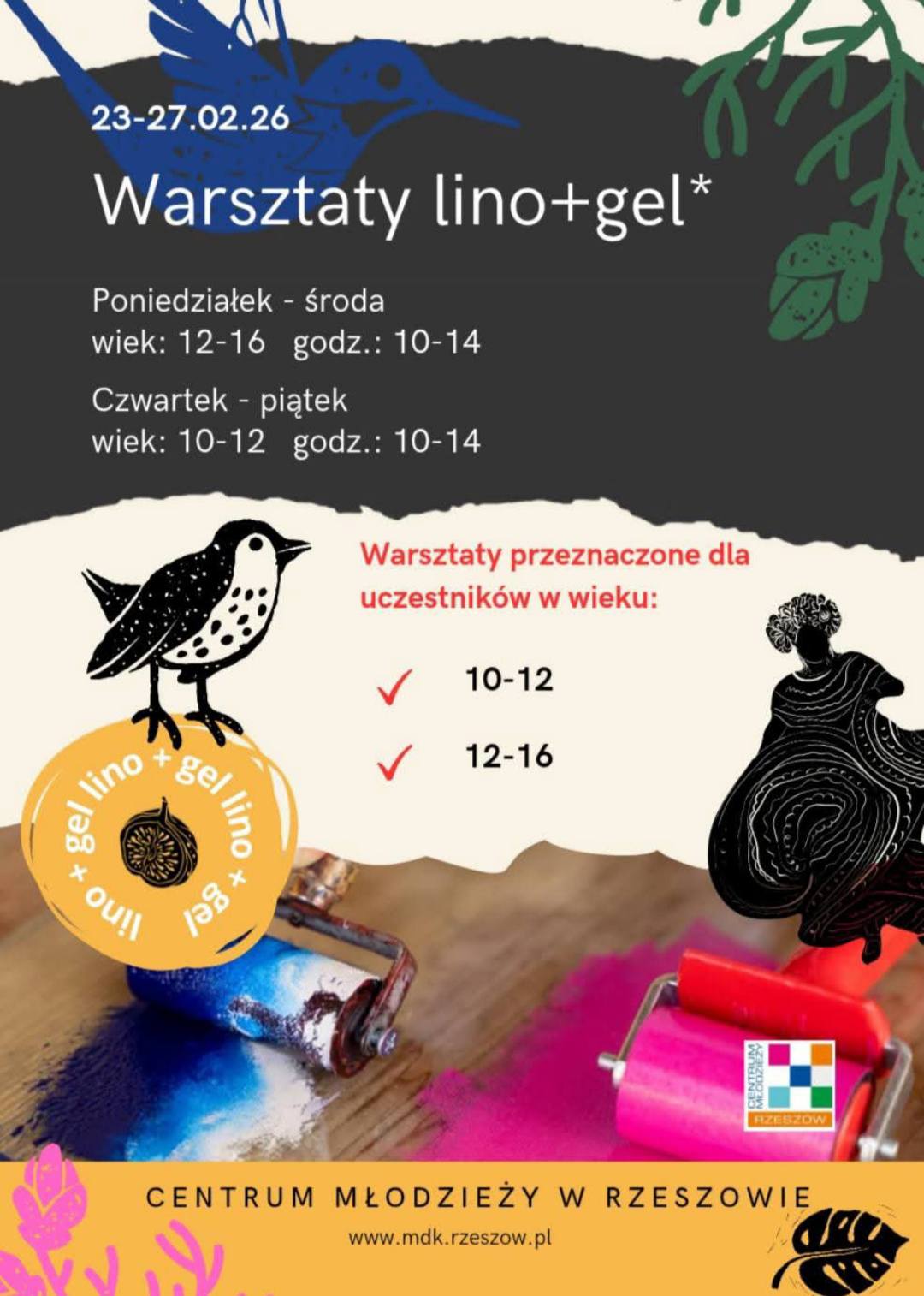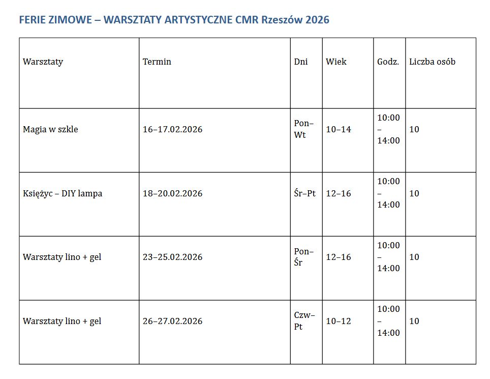 Magdalena Sierżęga 30 stycznia, 2026 Aktualności, Uncategorized Warsztaty Artystyczne – Ferie Zimowe 2026 Zapraszamy na warsztaty artystyczne do Centrum Młodzieży przy ul.Osmeckiego 51 w Rzeszowie. Nauczyciel prowadzący : Małgorzata Gilarska 1. MAGIA W SZKLEData: 16-17.02.2026, Godz. 10.00-14.00Wiek: 10-14 lat 2. KSIĘŻYC DIY LAMPAData: 18-20.02.2026r.Godz. 10.00-14.00Wiek:12-16 lat 3. WARSZTATY LINO + GELData: 23-25.02.2026r.Godz. 10.00-14.00Wiek: 12-16 lat……….Data: 26-27.02.2026r.Godz. 10.00-14.00Wiek: 10-12 lat. ZAPISY na warsztaty przyjmujemy w formie on-linezapisy@mdk.erzeszow.plZapisy na warsztaty przyjmowane są wyłącznie poprzez czytelnie wypełnienie, podpisanie a następnie przeskanowanie wszystkich załączonych dokumentów:– wniosek o przyjęcie– oświadczenieI przesłanie drogą e-mail tylko i wyłącznie na adres zapisy@mdk.erzeszow.pl