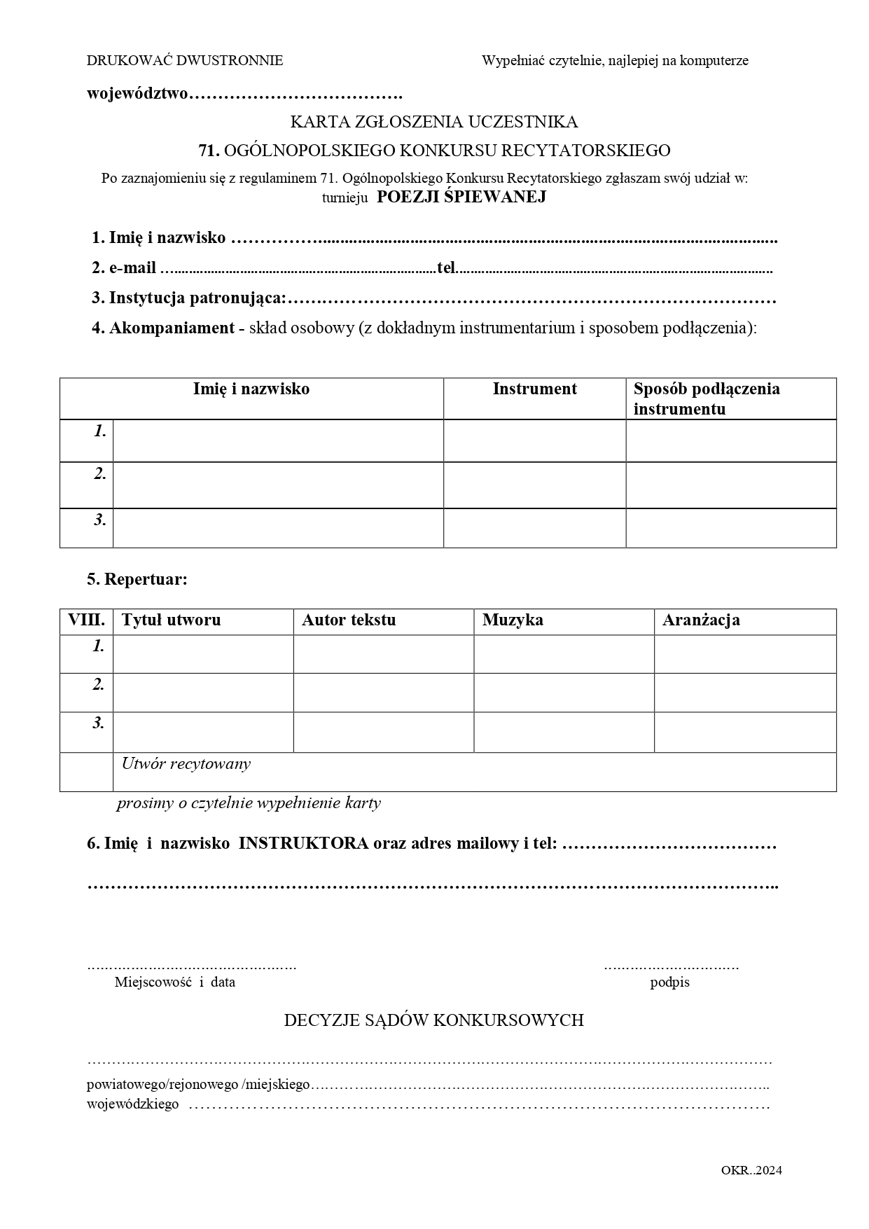 do 5 wykonawców w kategorii recytacji, do 2 osób w kategoriach: poezja śpiewana