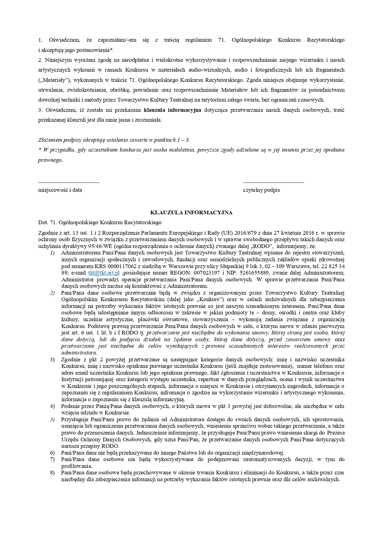 Warunkiem udziału w konkursie jest czytelne (litery drukowane, czcionka Arial, rozm. 12) i dokładne wypełnienie karty uczestnictwa oraz jej przesłanie lub doręczenie do dnia 10.03.2026r. (karty są również do pobrania na stronach: www.cmr.rzeszow.pl, www.tkt.art.pl)
