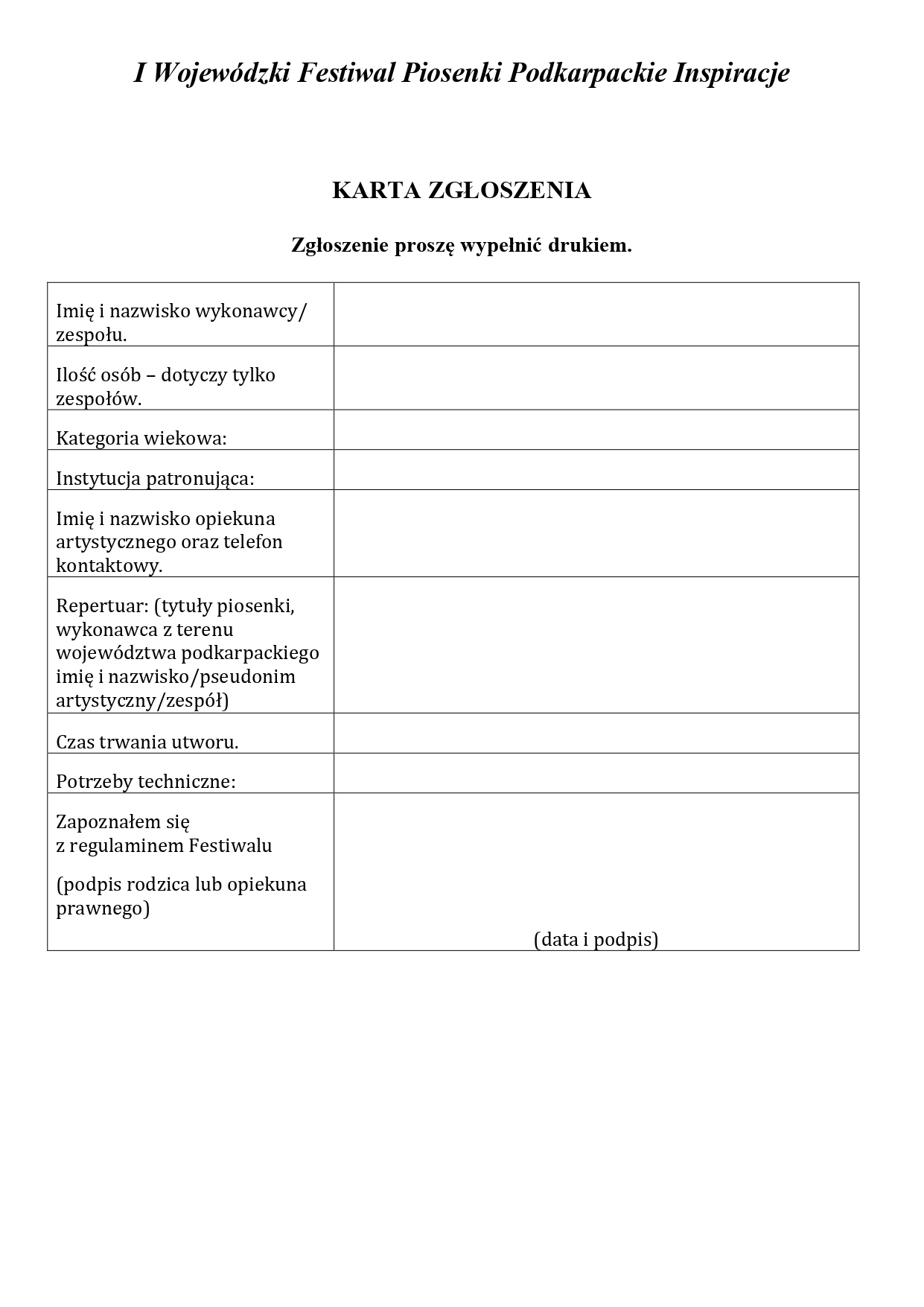 w mediach patronackich w celach promocyjnych i dokumentacyjnych festiwalu. - Organizator zapewnia aparaturę nagłaśniającą.