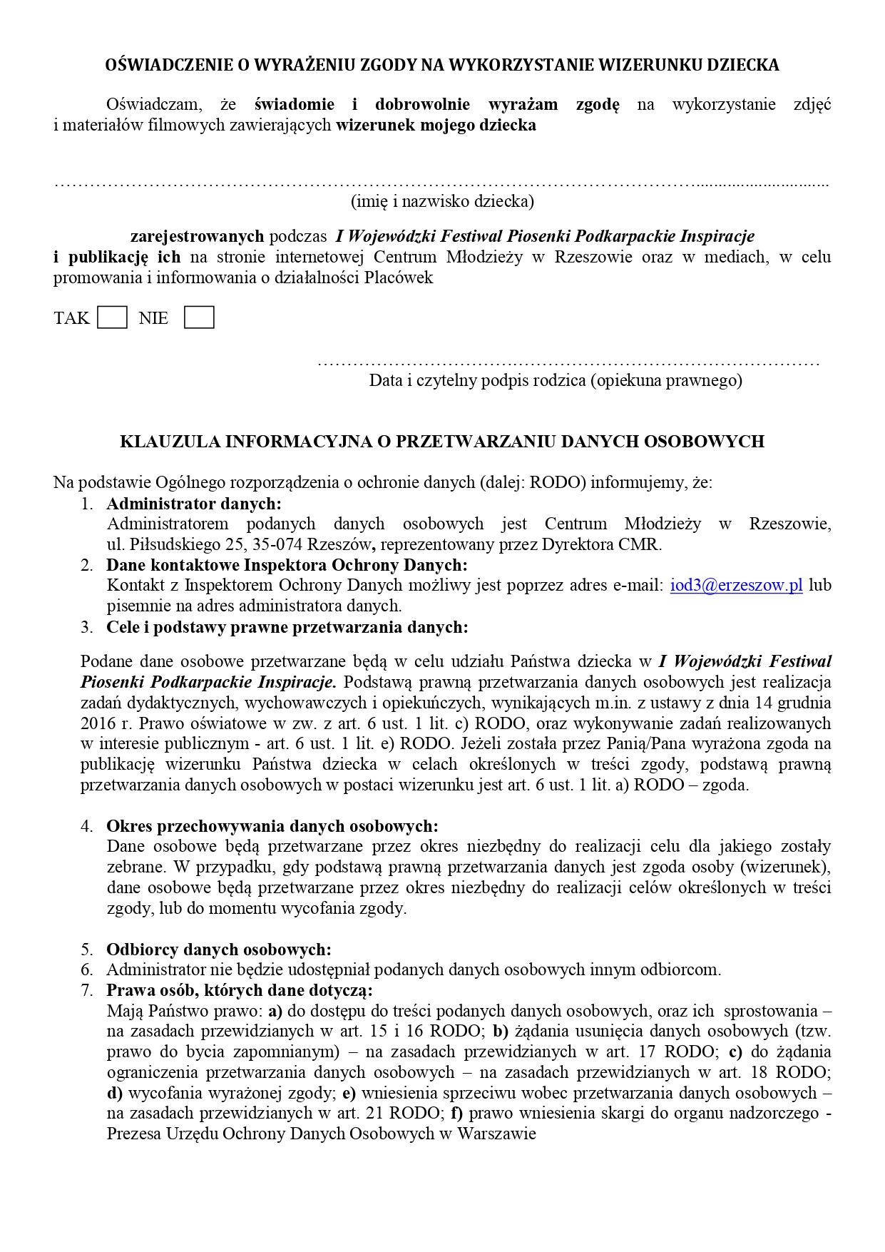 - Uczestnik (a w przypadku osób niepełnoletnich jego opiekun prawny) wyraża zgodę na nieodpłatne utrwalanie, rejestrowanie, fotografowanie oraz filmowanie występów, a także publikację materiałów audio-video i fotograficznych