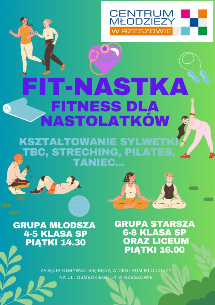 Fit-nastka-zajęcia fitness dla młodzieży obejmujące różnorodne formy gimnastyki (TBC- total body condtitioning, pilates, streching, zdrowy kręgosup i inne).
